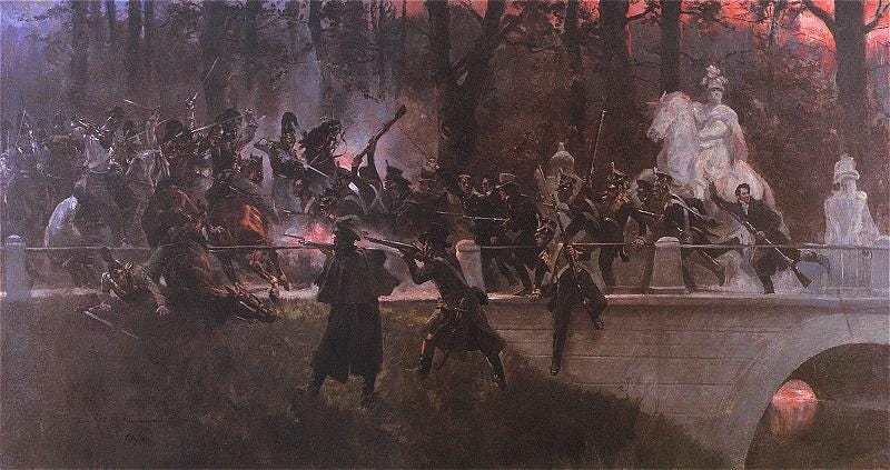 195 years ago tonight, Polish cadets from the Congress Kingdom’s Military Academy revolted and attacked the Belweder Palace, the seat of the Russian Grand Duke Governor. In Kossak’s painting, the statue of King Jan Sobieski almost appears to be leading the cadets.