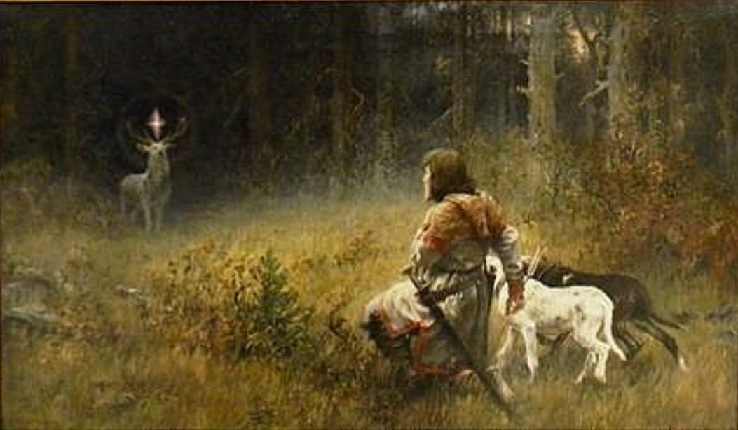 Tradition holds that Hubert was a 7th Century heir to a Frankish dukedom and as a young man was excessively fond of Hunting. In fact, quite impiously Hubert went out stag hunting on Good Friday, when good Christians were supposed to be in church. Hubert came upon a magnificent stag, and was just about to shoot it with his bow, when between the stag’s great antlers appeared a glowing gold crucifix, and Hubert heard a voice warning him to repent or he would surely burn in Hell.